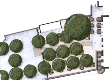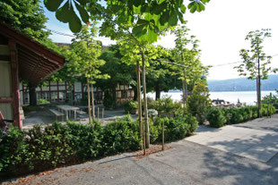 Ein kranker, aber wertvoller Baumbestand löste die Umgebungsrenovation aus. Um den Asphalt entfernen zu können, mussten abhaldige Flächen begradigt werden. Neu überbrücken Stellplatten und eine Sitzmauer Höhenunterschiede und flachen den Apéro- und Sitzbereich ab. So können Kiesflächen entsiegelt und der ergänzte Baumbestand langfristig überleben. Durch eine Hecke, welche die Parkierung abgrenzt, leitet ein Plattenweg nun direkt zum Eingang. Er teilt den Bedienten vom Selbstbedienungsbereich, wo ein Sitzrondell einen besonders hoch gelegenen Baum umfasst. Passender Sandstein und die auf den Gebäuderiegel ausgerichtete Gestaltung überzeugten die erst skeptische Denkmalpflege vom grossen Eingriff der Terrainneugestaltung.
