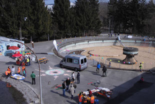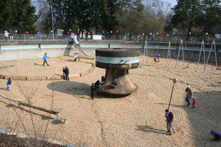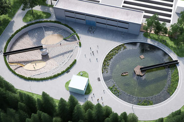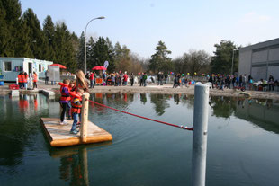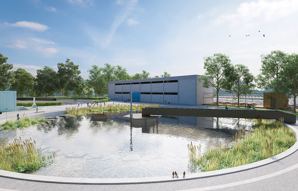 Aus zwei ehemaligen Klärbecken wird ein ‚Schilfteich’ und eine ‚Schnitzelgrube’ für Spiel und Erholung für Kinder und Familien gemäss der unterstützdenden Leopold Bachmann Stiftung. Dafür ist ein Becken mit Wasser gefüllt, einem Floss versehen und die Ränder bepflanzt worden. Eine Kiesrampe erschliesst das zweite Becken in dem Schauckeln, slackline, Sandkasten mit Schattiertuch, Rammelzone, Seilbahn und Riesenrutsche zum Spiel animieren. Ergänzend bieten umgenutzte Baracken einen Raum für die Jugendlichen an. Eine Pergola mit Sitzplatz kann mit einer Küche im Festraum gemietet werden,.