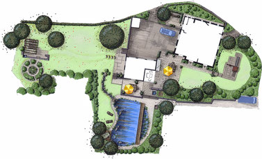 Ein Spielgarten im Osten sowie ein Naturgarten mit Gemüsebeeten und Pergola in einer Naturwiese im Westen vervollständigen diesen erholsamen Feriengarten.