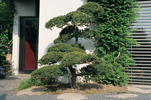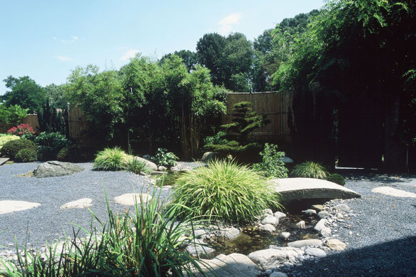 Eine Gartenerweiterung auf einer unterirdischen Garage gab den Anstoss zur Neugestaltung des Kleingartens. Ein erhöhtes Holzdeck bedeckt das Dach der neuen Garage und dient als geborgener Sitzplatz mit Blick auf das Haus. Eine Verengung gliedert den Garten und leitet über zu einem grossen Kiesplatz mit Bachlauf. Dieser startet eine halbe Etage erhöht hinter dem Haus und sprudelt über runde Flusssteine unter einer Brücke hindurch zu einer Duschplattform aus Holz. Flache Trittsteine wie in den japanischen Teegärten durchqueren die über die Diagonale angeordneten quadratischen Räume, welche durch den Hauszugang ein zweites Mal gegliedert werden. Als drittes folgt ein schattiger von hohem Bambus umfasster Gartenbereich mit Liegestuhl. Die Bepflanzung mit geschnittenen Bonsais als Blickfang, Azaleen und japanischen Seggen vervollständigt diesen von einer Bambusholzwand zur Strasse abgetrennten Kleingarten.