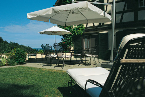 Vor dem Haus nimmt ein klassischer Vorgarten Bezug zur geometrischen Riegelstruktur. Parkplätze sind jeweils asphaltiert, Hauszugänge und Fusswege als Markierung gepflästert, von Rabatten zur Höhenabstufung unterbrochen. So weist dieser wunderbar geborgene Garten zwei komplett unterschiedliche Bereiche, verbunden durch eine klassisch, schlichte Gestaltung auf.