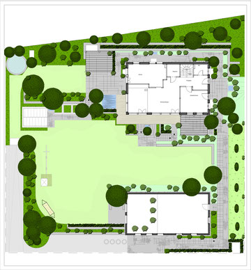 Böschungen und Terrassen überbrücken rund zehn Meter Höhenunterschied. So stehen aussichtsreiche Sitzplätze wie auch geborgenen Nischen zur Wahl. Der Spielgarten bedeckt die Hauptebene und verbindet das Garagendach mit dem halbversenkten Untergeschoss des Wohnhaus. Die Natursteintreppen leitet zum ein halbes Stockwerk erhöhten Wohngarten hinauf. Eine Steinmauer mit integrierter Grillstelle schafft einen starken Rückhalt für die Pergola, welche den Küchensitzplatz überspannt. Gut sicht- und kontrollierbar sind ein versenktes Trampolin und ein Sandkasten untergebracht, an dessen Stelle später ein Tauchbecken vorgesehen ist. Der Holzsteg leitet zum zweiten Sitzplatz mit der Büropergola über.